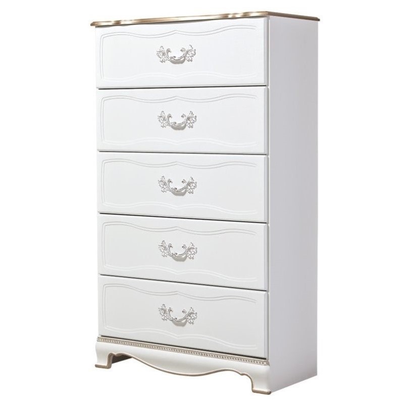 | Ashley Furniture - Chests - B35546 - Fit for a princess. Every girl would love to put her favorite clothes here because she'll feel like royalty with this elegant French-inspired Korabella chest of drawers. Rose gold color accents adorn this piece. Drawers open beautifully with sparkling rose gold colored handles inset with faux crystal accents.Finish: WhiteStyle: Traditional ClassicsReplicated oak grain5 Drawers3D pressed drawer fronts and detailed scroll and leaf appliques in rose color accent and inset faux crystalSide roller glides for smooth operating drawersSpecifications:Overall Product Dimensions: 32"" W x 16"" D x 55"" HOverall Product Weight: 122 lbsDrawer Interior DImensions: 28.75"" x 13.00"" x 6.50""